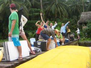 It rained. The boat broke down. We nearly capsized in big storm surf. I rode a piece-of-crap skateboard switch-stance on a roughly paved road strewn with deadly gravel while carrying a surfboard and looking over my shoulder laughing. I carried an open umbrella while riding a bicycle and posed as a hippy in a hostel while the real hippies ate pork and beans out of a can and stared. I passed up stand-up left tubes at a reef around the corner to pose on a longboard in mushy two footers. BUT by the end, while you might think I’d be desperate and relieved to hop on a plane and jet back to my normal life of pro surfing, I actually felt reluctant to leave.