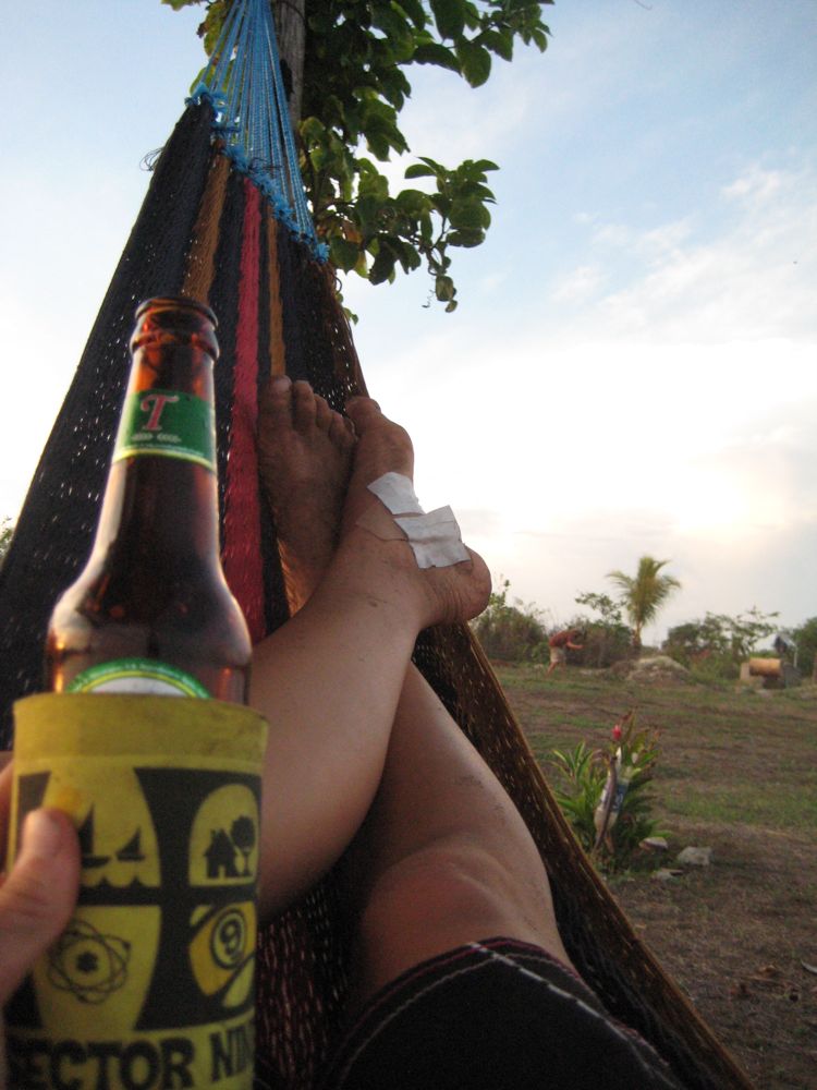 Shoveling manure for fertilizer and relaxing with a cold beer and dirty injured bare feet at my other home in Nicaragua.