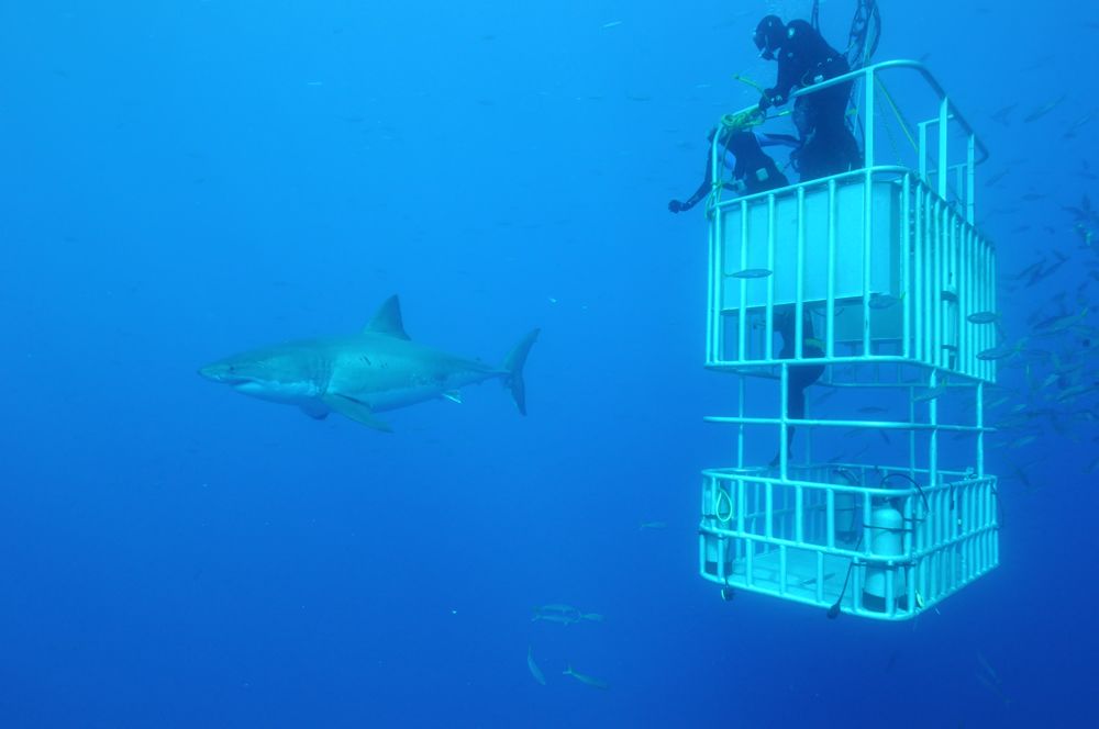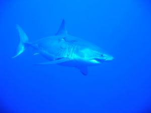 With a hookah regulator in mouth and weight belt on waist, we are dropped to forty feet like bait in a cage. A small burlap bag of fish parts turns the immediate vicinity blood red when shaken or kicked with a “thunk, thunk, thunk.” Our eyes, searching the deep blue emptiness for shadows. An insistent tap on my shoulder and I turn around to see Jenna pointing into the distance off the corner and all of us cram to that side, eyes wide, as the outline takes shape. A fifteen-foot female great white shark.