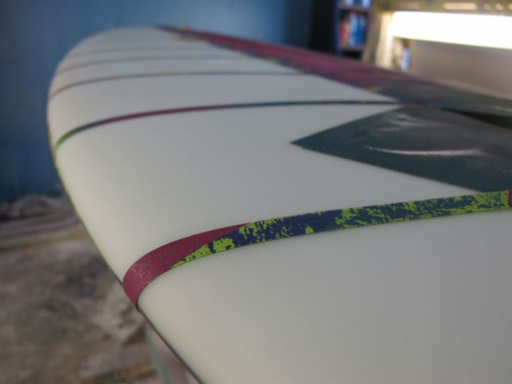 Of course, white surfboards are no good for photos, so the first step was to bust out the spray paint and get to work! My boyfriend has built a shaping room in our garage and equipped it with board rack, lights, masking tape of various widths, rolls of paper, and a selection of spray paint colors.