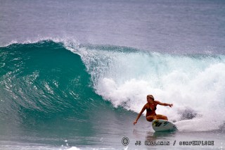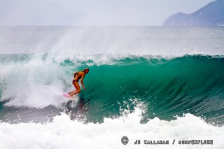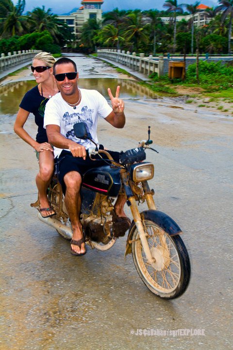 During our first few days on the island, which is referred to as “the Hawaii of China” complete with trains of tour busses belching out camera wielding couples in matching aloha pajamas who stand in line to pay $10 to get a printed photo of them sitting on a camel on the beach, I doubted the possibility of success in developing a strong market for surf tourism. The white sandy beaches, relatively clean clear water, and steamy temperatures were all there, but the surf seemed weak and inconsistent. A regular trade wind blows from the NW, bombarding the NE coast with constant wind swell. During the typhoon season, the potential for real groundswell to make the points come alive exists but is unreliable. We spent a few days surfing an onshore shore dump, coincidentally the mayor’s local spot, that was certainly entertaining but not enough to justify dragging a surfboard across the planet. We saw plenty of points and rocky ledges with potential. We searched for good coffee, learned to say beer in Chinese, and filled our bellies with shrimp, mussels, and other unidentifiable seafood. We pushed a few very excited middle aged Chinese men wearing speedos, goggles, and swim caps into their first six inch waves in front of a wall of camera-firing local journalists insisting on a surfing demonstration despite the nearly complete lack of ride-able surf.