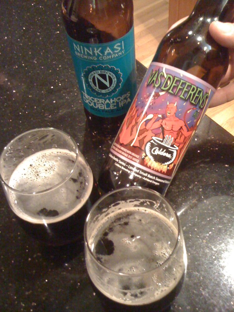 We took a big family outing to the Bridgeport Brewpub in Portland for burgers and a sampler of their beers on tap. The IPAs were standouts including the Hop Czar. They are definitely worth a try. While making dinner at home the following night, we tried the Bridgeport Nightcap Winter Ale. BeerAdvocate only gives it a “B” saying: “A balanced and very drinkable “big brew” winter ale. Wait is that possible…? As usual, Bridgeport serves up a balanced, tasty brew with high marks for drinkability. Cheers! Unfortunately, for a “winter warmer” and one that is partially aged in Makers Mark barrels, inspiring is not on the agenda for this Nightcap.” It might not be the most memorable Winter Ale but it is very drinkable. The Ninkasi Tricerahops Double IPA was memorable however. I definitely recommend that one. Featured more prominently in the photo is the Vas Deferens Ale from Caldera Brewery. We visited the brewpup in Ashland on our drive up to Portland (see that blog post here), and I couldn’t resist leaving with a 22 of the Vas Deferens Belgian Strong Dark Ale. Beer Advocate gives it a B- and the label is a bit of a turnoff, but it’s not a bad beer. I am a big fan of the Deschutes Brewery. We got a growler of the Cascade Ale for xmas and sampled it on the first night of our coastal road trip from Portland to LA in a yurt at the Nehalem State Park campground. Very refreshing! The next stop was the Rogue Brewery in Newport, Oregon. This place had a very cozy and friendly vibe. The Chipotle Ale was really good, but we ended up filling our growler with the Shakespeare Oatmeal Stout.I was really excited to check out the Russian River Brewery and enjoy a glass of Pliny the Elder Double IPA. Beer Advocate rates it as one of the best IPAs and it is very hard to find. Other than the Pliny, I was a little disappointed with the beers from Russian River.